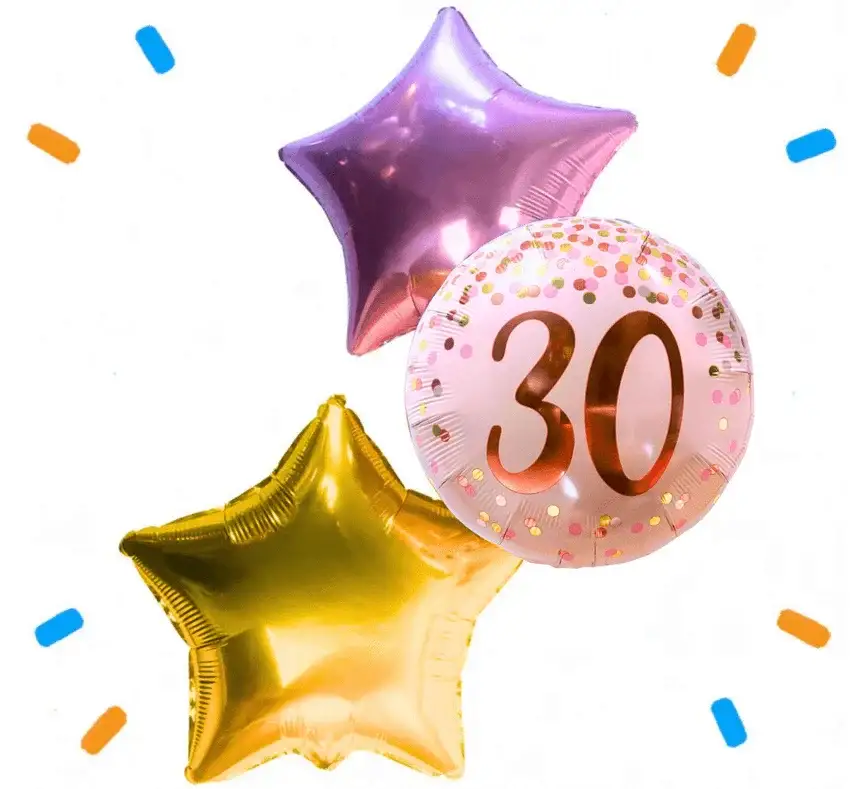 Ben je op zoek naar een unieke manier om een mijlpaal te vieren? Onze 30 Jaar Trosje Roze/Goud/Rose Goud ballonnen zijn gevuld met helium. Ze zijn perfect voor jouw feest of evenement. Met een grootte van 46 cm zijn ze een opvallende decoratie. Ze zijn ook een symbool van een mooie 30-jarige reis.