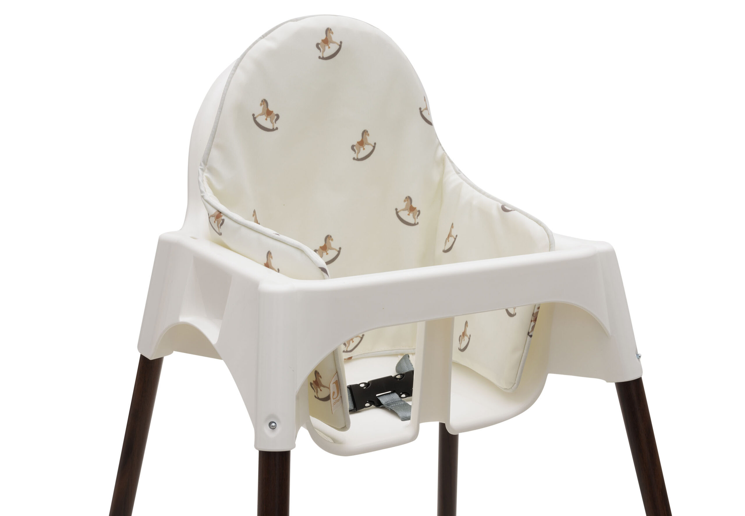 Nieuw in ons assortiment zijn onze kinderstoelkussens die perfect passen in de kinderstoelen van IKEA. Deze kussens hebben geen zitje onderaan maar vormen zich als een extra laag in de stoel om het rugje van je kleintje. De verhoogde armleuningen zorgen ervoor dat je kindje rechtop blijft zitten, en de lusjes aan dit kussen zorgen ervoor dat deze helemaal vast zit. Het materiaal is waterafstotend en neem je gemakkelijk af met een natte doek. Hoe leuk is de Nostalgic Ride print met lieve hobbelpaardjes en oatmeal kleur?
